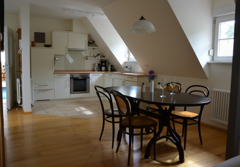 Die Wohnung ist für zwei Personen (Doppelbett 180 cm) vorgesehen. Sie können sie auch für drei oder vier Personen mieten. Dann kommt das gegenüber liegende Turmzimmer hinzu. Damit steht Ihnen das komplette Dachgeschoss zur Verfügung.